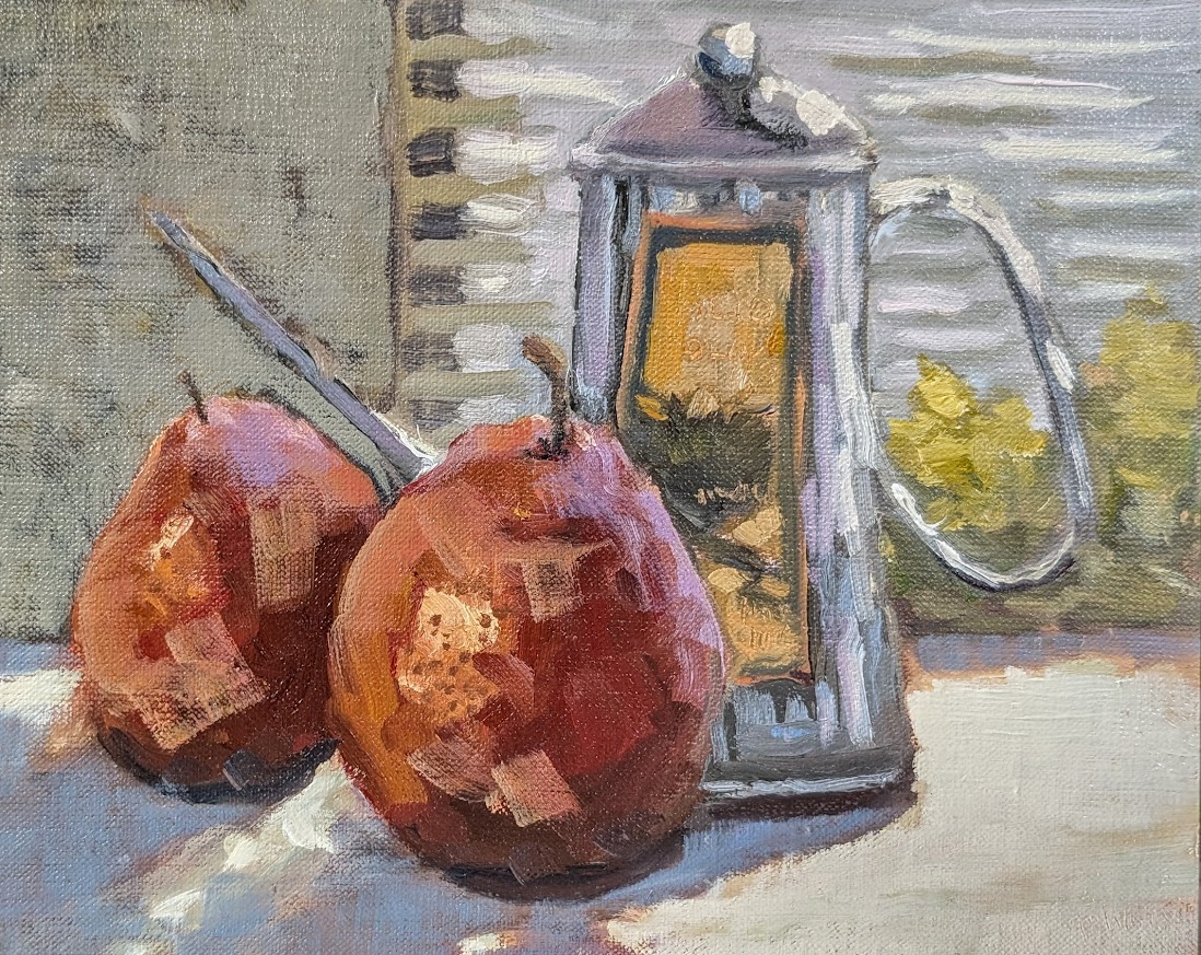 Red Pears & Olive Oil – 8 x 10 oil on panel