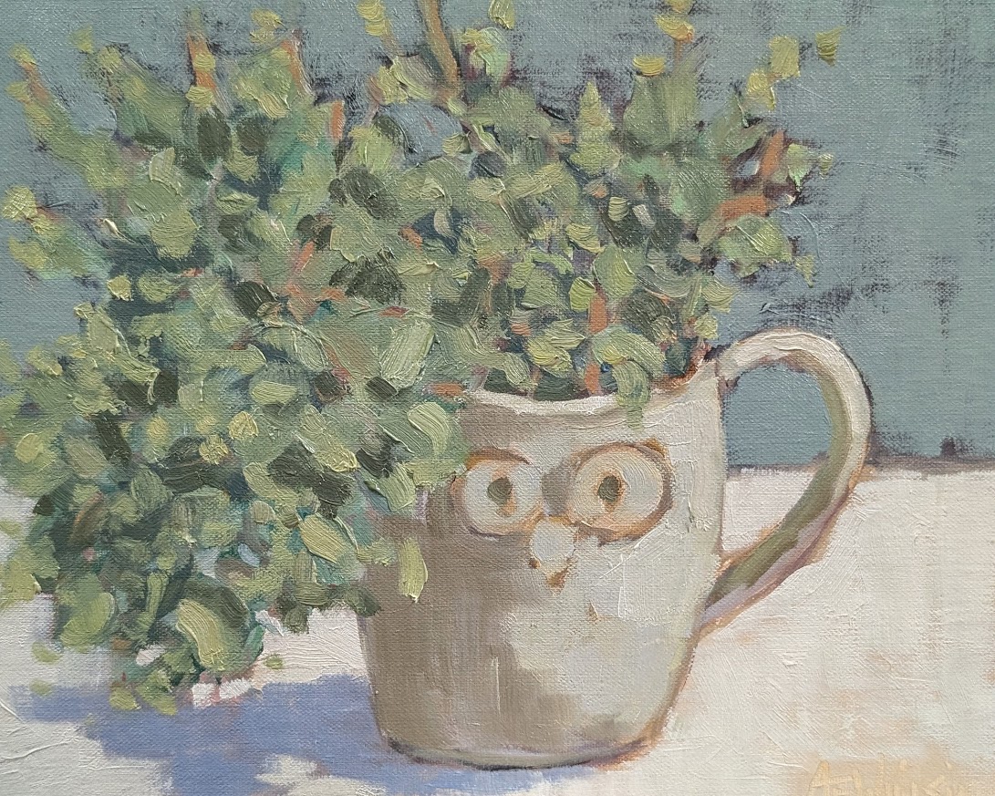 Succulent in Owl Mug – 8 x 10 oil on panel